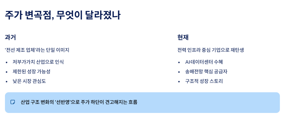 최근 2~3년간 대한전선 주가는 확실한 변곡점을 지나왔습니다. 과거에는 ‘전선 제조 업체’라는 단일 이미지에 갇혀 있었지만, 지금은 전력 인프라 중심 기업으로 체질이 달라졌다는 평가가 많습니다.