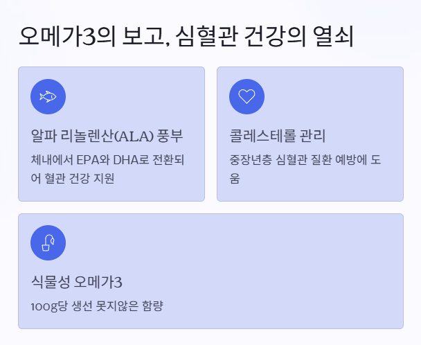 중장년층에게 중요한 콜레스테롤 관리나 심혈관 질환 예방 차원에서도, 꾸준히 섭취하면 긍정적인 변화가 있을 수 있어요. 다만 생선과 달리 식물성 오메가3이기 때문에, 흡수율은 차이가 있을 수 있다는 점도 참고하세요.