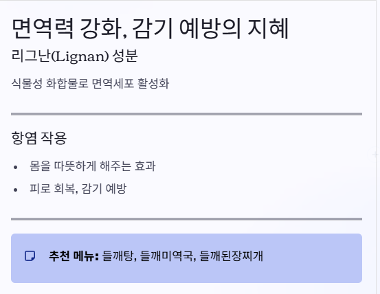 피곤하고 쉽게 감기에 걸리는 시기엔 특히 몸을 따뜻하게 해주는 들깨가루를 활용한 음식들이 잘 맞죠. 들깨탕, 들깨미역국, 들깨된장찌개처럼 면역력과 영양을 동시에 챙길 수 있는 메뉴도 다양하게 구성할 수 있어요.
