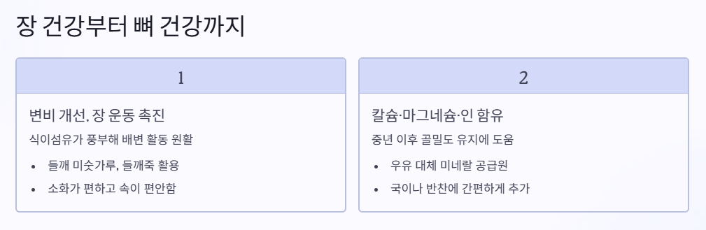 특히 중년 이후 골밀도가 낮아지는 분들에게는 이런 미네랄 섭취가 꽤 중요하잖아요. 우유나 유제품을 잘 못 드시는 분이라면, 들깨가루를 국이나 반찬에 넣어 보완해 보는 것도 좋을 것 같아요.