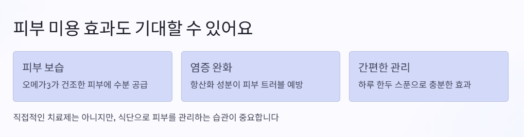 물론 직접적인 치료제는 아니지만, 평소에 피부가 쉽게 건조해지거나 예민한 편이라면 식단으로 관리하는 습관도 중요하니까요. 하루 한두 스푼 정도만 넣어도 충분하다고 하니, 간단하게 시도해 볼 수 있어요.