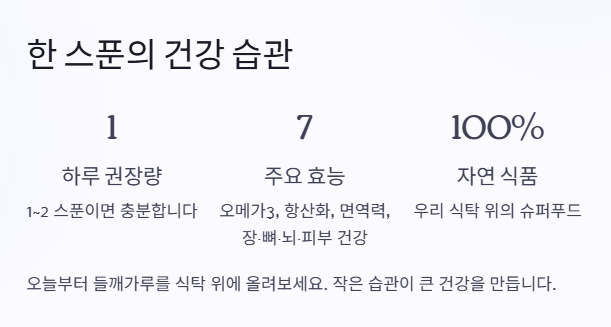 특히 피부 탄력이나 면역력이 떨어지기 쉬운 계절에는 항산화 식품이 중요하잖아요. 들깨가루는 일상 식단에 간단히 추가할 수 있어서, 큰 부담 없이 항산화 성분을 섭취할 수 있다는 점이 장점이에요.