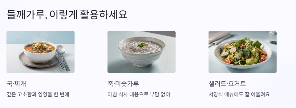 평소 먹는 국이나 죽, 샐러드, 요거트에 한 스푼씩만 넣어도 충분한 효과를 기대할 수 있으니 오늘부터라도 식탁 위에 들깨가루를 올려보는 건 어떨까요?
