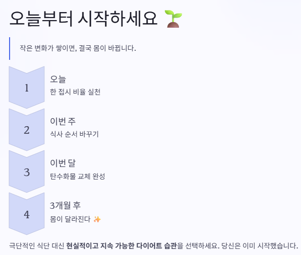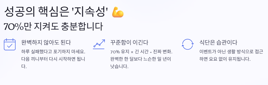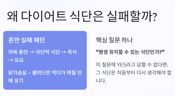 그래서 중요한 건 단 하나입니다. 👉 “평생 유지할 수 있는 다이어트 식단인가?” 이 질문에 “예”라고 답할 수 있어야 합니다.
