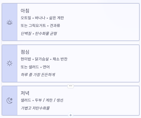 - 샐러드 + 단백질 (두부/계란/생선)