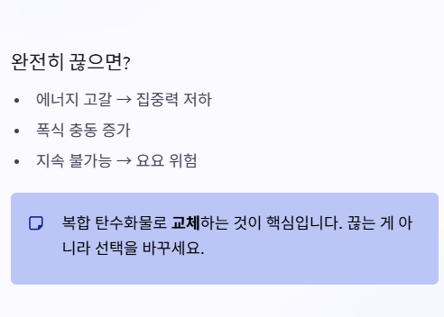 탄수화물을 완전히 끊는 것은 현실적으로 어렵고 건강에도 좋지 않습니다.