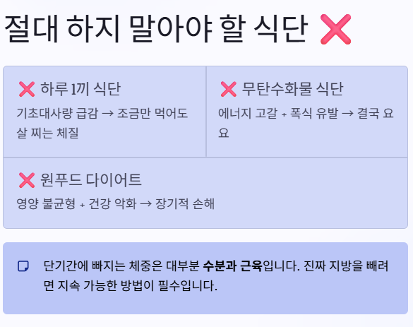 이런 방식은 단기적으로 체중이 줄어들 수 있지만 결국 요요 + 건강 악화로 이어집니다.