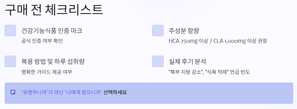 • 주성분 함량 (HCA 750mg 이상, CLA 1,000mg 이상 권장)