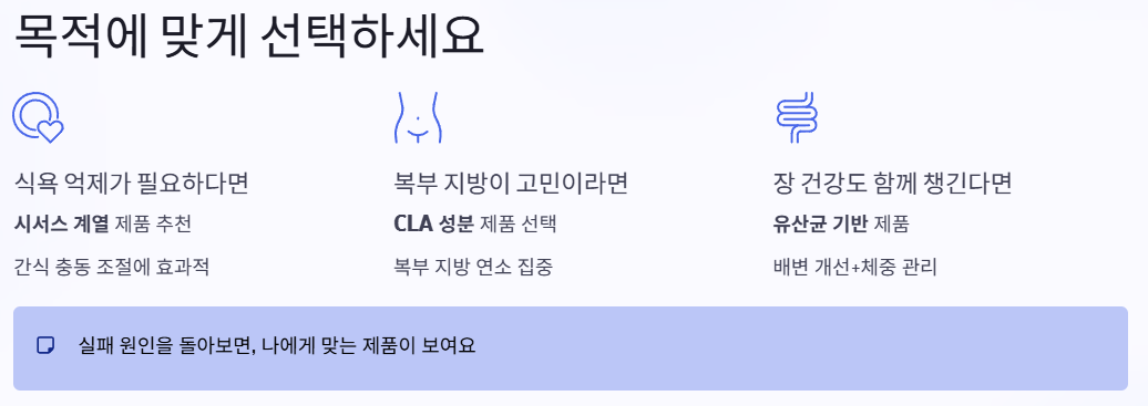 모든 다이어트 보조제가 똑같이 작용하진 않아요. 예를 들어 식욕이 너무 세서 자꾸 간식을 찾는 분이라면 시서스 계열이 효과적일 수 있어요. 반면 복부 지방이 걱정되는 분CLA 성분이 들어간 제품이 더 나을 수 있죠.