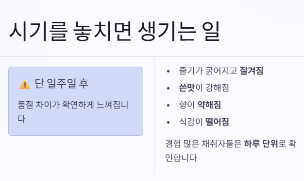 혹시 “며칠 늦어도 괜찮겠지?”라고 생각하셨다면, 생각보다 큰 차이를 경험하게 됩니다. 두릅은 성장 속도가 빠르기 때문에 채취시기를 놓치면 다음과 같은 변화가 나타납니다.