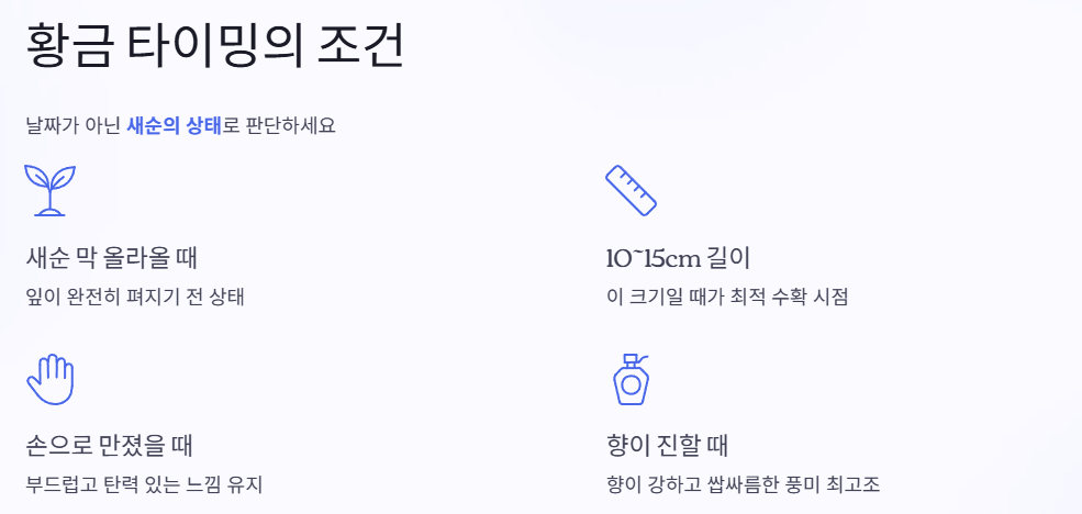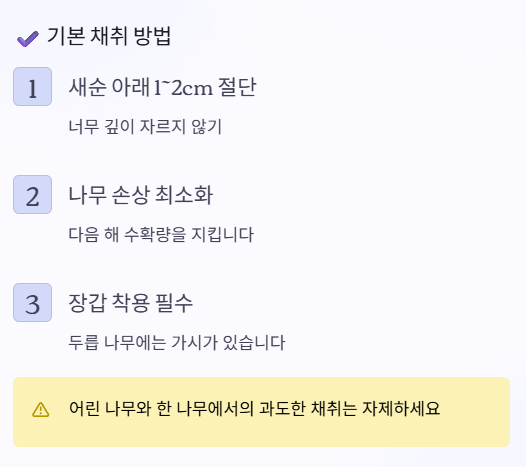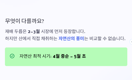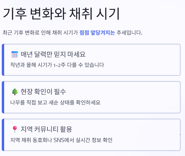 이 조건이 맞으면 바로 채취 타이밍입니다. 또한 최근에는 기후 변화로 인해 채취 시기가 점점 빨라지는 경향이 있으므로