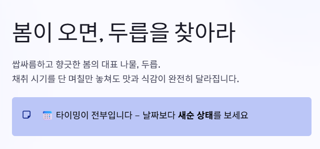 봄이 짧듯이, 두릅의 제철도 매우 짧습니다. 단 며칠의 차이로 맛이 완전히 달라지는 만큼, 타이밍을 잘 잡아 가장 맛있는 두릅을 즐겨보시길 바랍니다 🌿