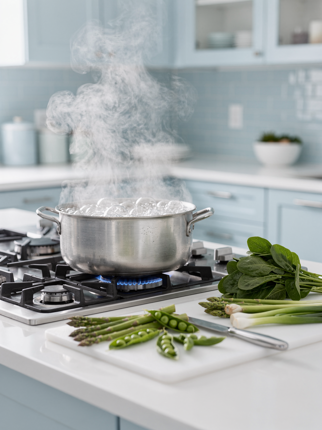 이제 본격적으로 두릅 데치기 방법을 알아보겠습니다. 많은 사람들이 가장 궁금해하는 부분이 바로 “두릅 데치는 시간”입니다. 먼저 냄비에 물을 넉넉히 붓고 소금을 0.5큰술 정도 넣어 주세요. 소금을 넣는 이유는 색감을 선명하게 유지하고 쓴맛을 줄이기 위해서입니다.