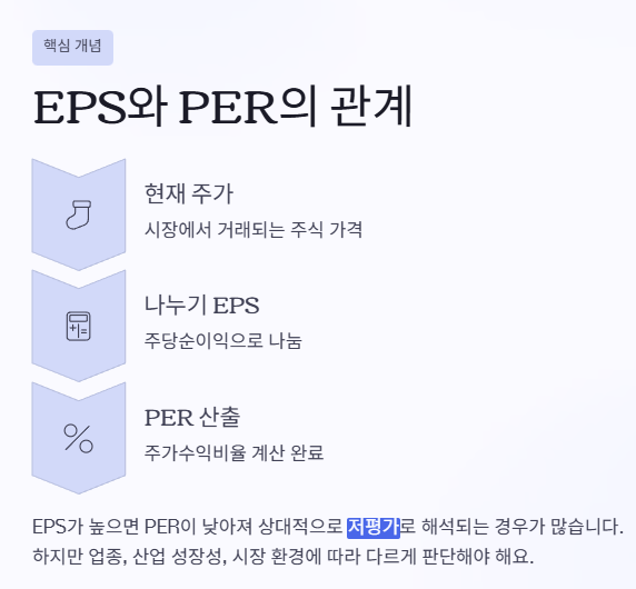 EPS가 높을수록 PER이 낮아져 상대적으로 ‘저평가’로 해석되는 경우가 많아요. 하지만 이 또한 절대적인 기준이 아니라 업종, 산업 성장성, 시장 환경 등에 따라 다르게 해석됩니다. 즉, EPS는 PER의 계산 기초가 되는 만큼, EPS부터 제대로 이해하는 것이 중요해요.