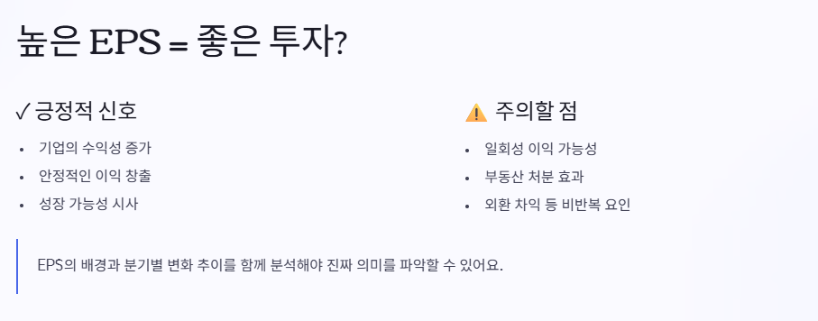 일반적으로 EPS가 높다는 건 기업이 그만큼 많은 순이익을 내고 있다는 뜻이므로 긍정적인 신호로 받아들여집니다. 하지만 단순히 수치만 보는 것은 위험할 수 있어요.