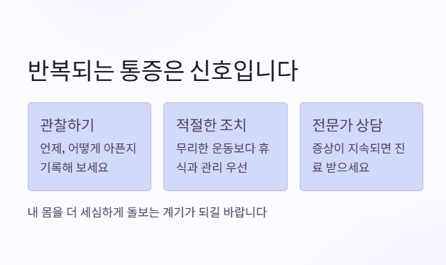 오늘 소개한 7가지 이유 중 하나라도 해당된다면, 무리한 운동이나 방치보다는 내 몸을 조금 더 관찰해 보는 계기로 삼아 보세요.