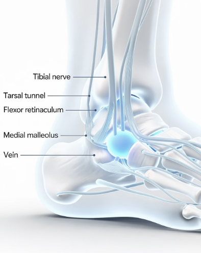 단순한 근육 통증이 아니라, 발가락 쪽으로 저리거나 타는 듯한 느낌까지 동반된다면 신경 포착 증후군을 의심해 볼 수 있어요. 특히 ‘티널 증후군’이라 불리는 족근관 증후군이 대표적입니다. 발목 안쪽을 지나가는 경로에 신경이 눌리면서 통증과 저림이 발바닥까지 퍼지는 건데요.