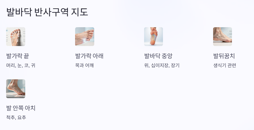 발바닥은 여러 구역으로 나뉘는데, 대표적인 위치와 대응 기관을 간단히 소개해볼게요.