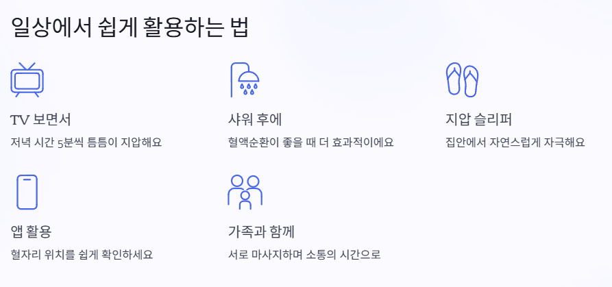 매일 아침이나 저녁, TV 보면서 또는 샤워 후에 5분씩 지압해 보세요. 지압 슬리퍼를 활용하거나, 지압 돌판 위에서 걷는 것도 좋은 방법이에요. 요즘은 앱에서도 혈자리 위치를 쉽게 확인할 수 있도록 도와주는 기능들이 있으니 참고해 보는 것도 좋고요.