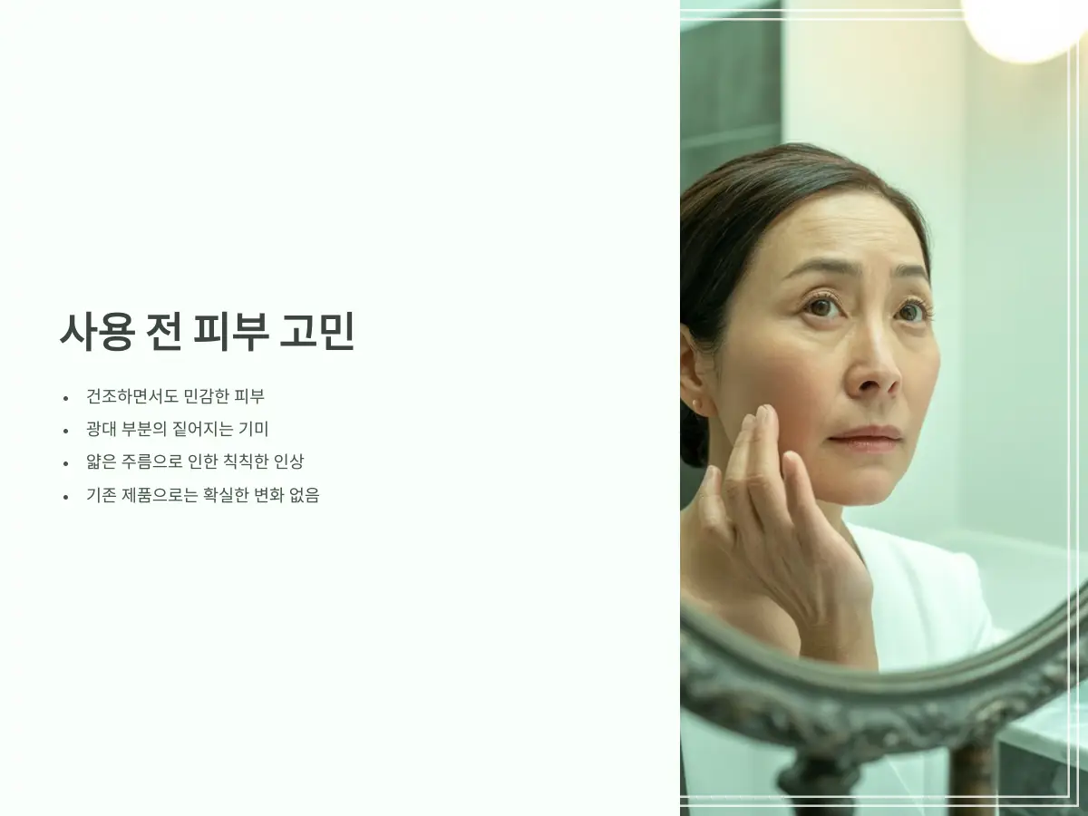 50대를 넘기고 피부에 대한 고민이 커지면서 자연스럽게 화장품에도 눈이 가게 되었어요. 특히 거울을 볼 때마다 도드라지는 기미와 잔주름은 나이를 실감하게 만들더라고요.