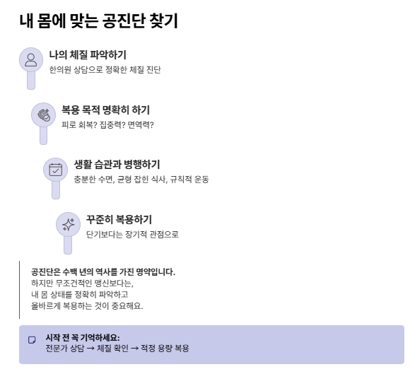 공진단은 수백 년 전부터 사용 돼온 만큼, 그 효능에 대한 기대감이 큰 보약 중 하나예요. 하지만 무조건적인 맹신보다는, 내 몸에 맞는지, 어떤 목적으로 복용하는지, 생활 습관과 함께 관리할 수 있는지를 고민하며 복용해야 효과도 제대로 볼 수 있어요.