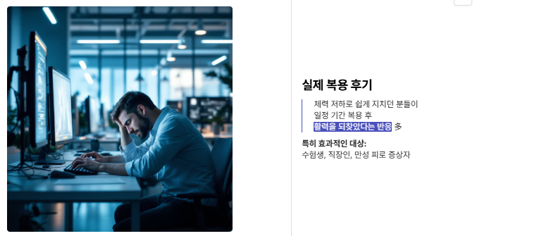 특히 수험생 부모님들이 자녀에게 복용시키는 경우도 있고요. 단기간에 극적인 변화를 기대하기보다는, 일정 기간 꾸준히 복용하며 체력 저하를 완화하는 방식이 더 현실적이에요.
