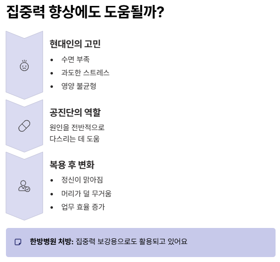현대인의 고질병 중 하나가 바로 집중력 저하죠. 수면 부족이나 스트레스, 영양 불균형 등이 원인이 되기도 하는데요. 공진단은 이런 원인들을 전반적으로 다스리는 데 도움을 줄 수 있다고 알려져 있어요.