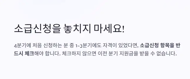여기서 중요한 게 바로 이 소급신청이에요. 4분기에 처음 신청하는 분들 중, 1~3분기에도 자격이 있었던 분들은 소급 신청 항목을 꼭 체크해야 해요.