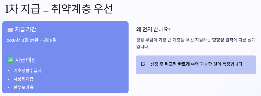 취약계층은 생활 부담이 더 크기 때문에 가장 먼저 지급됩니다. 신청 후 비교적 빠르게 수령이 가능하다는 점이 특징입니다.