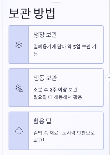 또한 소분하여 냉동 보관하면 2주 정도 보관이 가능하며 필요할 때 해동해서 먹으면 편리합니다. 김밥 재료로 활용하거나 도시락 반찬으로도 매우 좋습니다.