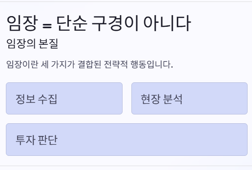 즉, 임장이란 정보 수집 + 분석 + 판단이 결합된 행동입니다.