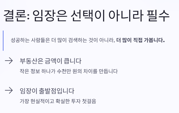 그래서 성공하는 사람들은 더 많이 검색하는 것이 아니라 더 많이 직접 가봅니다. 결국 임장은 부동산 성공의 출발점이자, 가장 현실적인 투자 방법입니다.