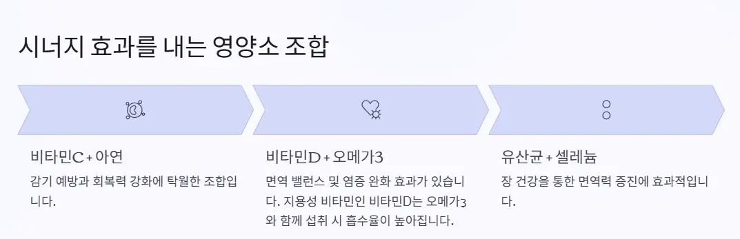 하나만 섭취하는 것보다 서로 시너지를 줄 수 있는 조합이 효과적이에요. 특히 비타민D는 지용성 비타민이라 오메가3와 함께 섭취 시 흡수율이 높아진다는 점도 기억해 두세요.