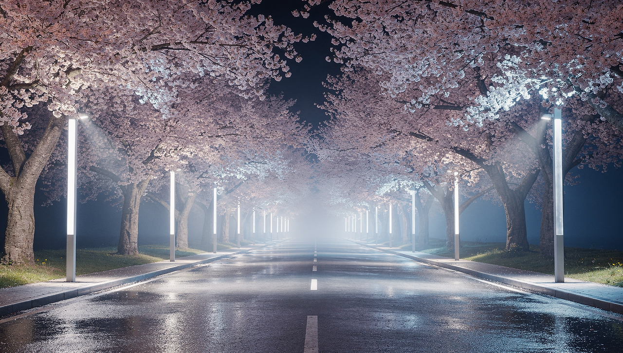- 길 양쪽으로 이어진 벚꽃 터널