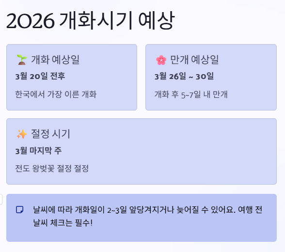 - 만개 예상일: 2026년 3월 26일 ~ 3월 30일