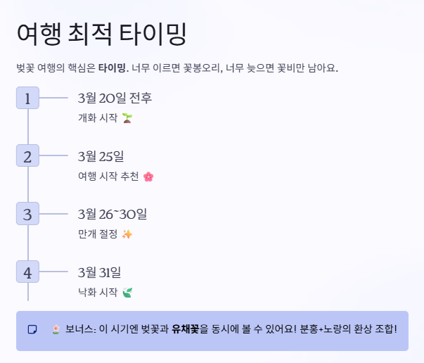 벚꽃 여행에서 가장 중요한 것은 바로 타이밍입니다. 너무 이르면 꽃이 덜 피어 있고, 늦으면 꽃이 떨어져 버리기 때문입니다.