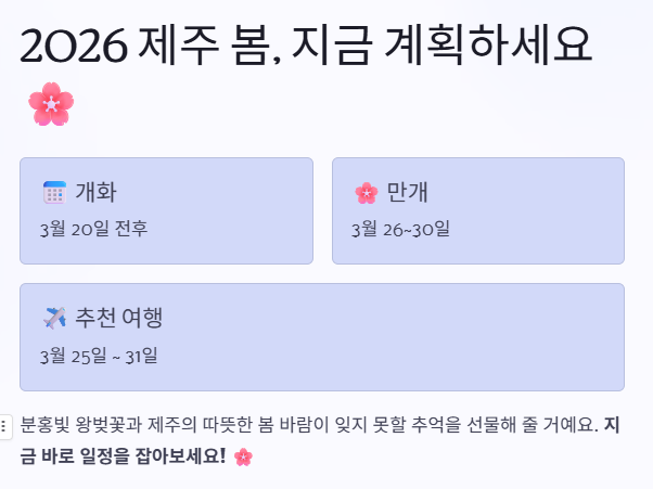 2026년 봄 여행을 계획하고 있다면 제주 벚꽃 시즌인 3월 말에 맞춰 여행 일정을 준비해 보세요. 분홍빛 벚꽃과 따뜻한 제주 봄 풍경이 여러분에게 잊지 못할 추억을 선물해 줄 것입니다. 🌸