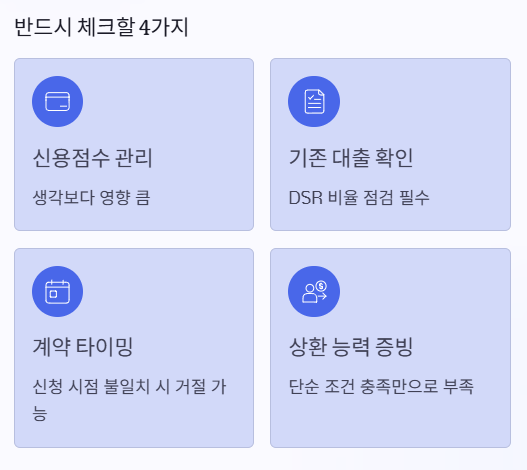 특히 최근에는 ‘상환 능력’이 핵심 평가 기준이기 때문에, 단순 조건 충족만으로는 부족합니다.