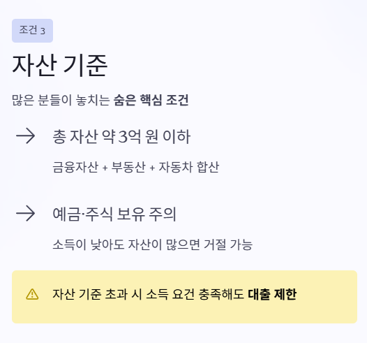 이 조건은 특히 예금이나 주식이 많은 경우 영향을 크게 받습니다. 소득은 낮아도 자산이 많으면 대출이 거절될 수 있다는 점, 반드시 체크해야 합니다.