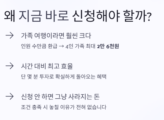 특히 가족 여행이라면 인원수만큼 환급이 이루어지기 때문에 체감 금액이 훨씬 커집니다. 무엇보다 신청 과정이 간단하기 때문에 시간 대비 효율이 매우 높은 혜택이라고 볼 수 있습니다.