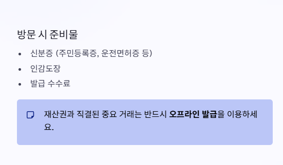 즉, 재산권과 직접적으로 연결되는 중요한 용도는 여전히 오프라인 발급이 필요합니다. 이 부분을 모르고 신청하면 시간만 낭비할 수 있기 때문에 반드시 확인해야 합니다.