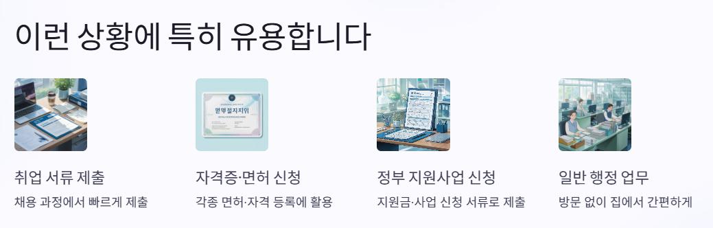 - ✅ 가능: 일반 행정 제출용, 경력 증명, 면허 신청 등