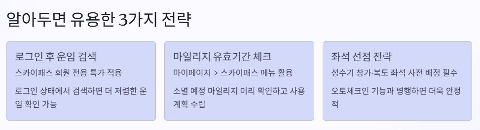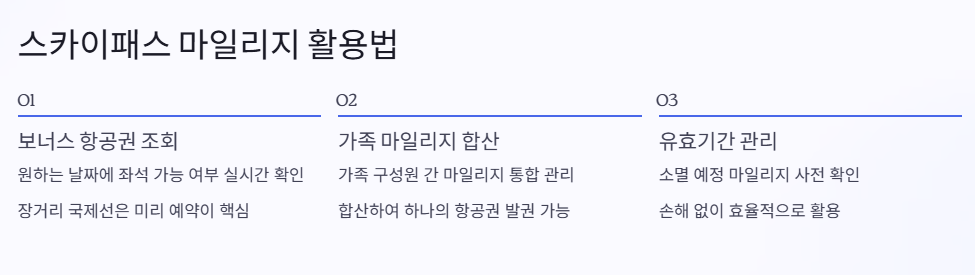 마일리지 유효기간 확인: ‘마이페이지 > 스카이패스’ 메뉴에서 소멸 예정 마일리지를 확인해 두면 손해 없이 활용할 수 있습니다.