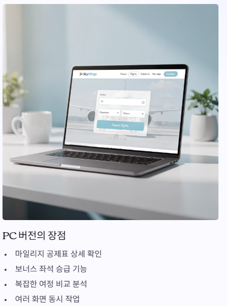 모바일도 편리하지만, 복잡한 여정 변경이나 마일리지 승급 같은 정밀한 기능은 아무래도 PC에서 사용하는 것이 더 안정적이죠. 특히 큰 화면에서 좌석배치도를 확인하거나, 마일리지 공제표를 살펴보는 작업은 데스크톱 환경이 훨씬 쾌적합니다.