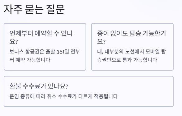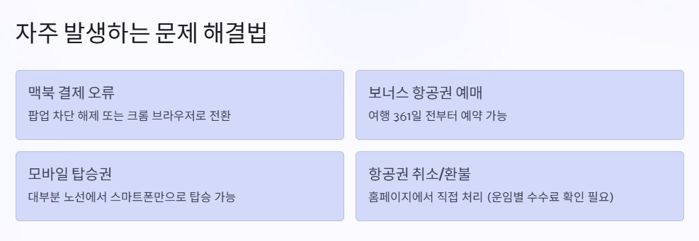 • 항공권 취소/환불: 홈페이지에서 직접 가능하지만, 운임 종류에 따라 수수료 발생 가능