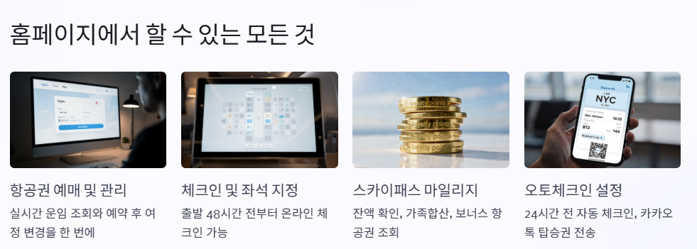 • 스카이패스 마일리지: 마일리지 잔액 확인, 가족합산 등록, 보너스 항공권 조회 등이 가능합니다.