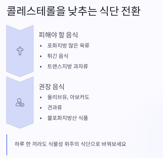 식습관은 콜레스테롤 조절에 있어 가장 큰 변수예요. 포화지방이 많은 육류나 튀긴 음식, 트랜스지방이 함유된 과자류는 피하는 게 좋아요. 대신 불포화지방산이 풍부한 올리브유, 아보카도, 견과류를 꾸준히 섭취하면 도움이 됩니다.