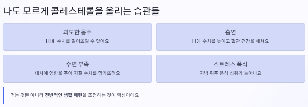무심코 하는 습관들 중에도 콜레스테롤 수치에 영향을 주는 요소가 많아요. 예를 들어 과도한 음주는 HDL 수치를 떨어뜨릴 수 있고, 흡연은 LDL 수치를 높일 수 있어요. 수면 부족도 대사에 영향을 주어 지질 수치를 망가뜨릴 수 있고요.