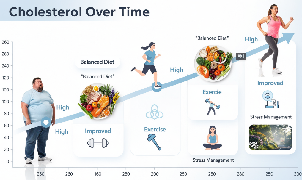 또, 스트레스를 받을 때 지방 위주의 음식에 손이 가는 경우가 많죠. 단순히 ‘먹는 것’만이 아니라 전반적인 생활 패턴을 조정하는 것이 콜레스테롤 조절의 핵심이에요.