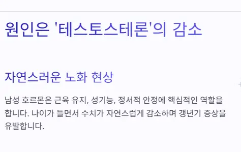 가장 큰 원인은 남성호르몬인 테스토스테론의 감소입니다. 이 호르몬은 근육 유지, 성기능, 감정 안정 등에 영향을 주는데, 나이가 들수록 자연스럽게 줄어들게 됩니다.